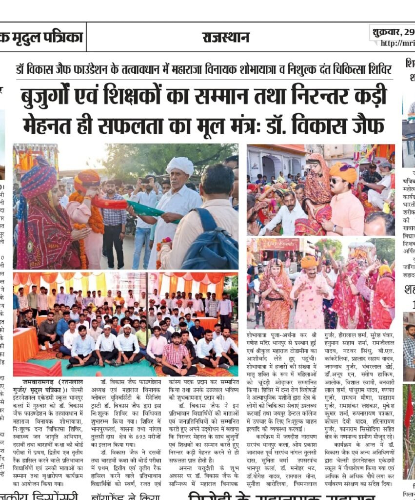 गुरुवार, 28 सितम्बर चेल्सी इंटरनेशनल एकेडमी स्कूल में डॉ. विकास जैफ फाउण्डेशन के तत्वावधान में महाराज विनायक शोभायात्रा, निःशुल्क दन्त चिकित्सा शिविर, स्वास्थ्य जन जागृति अभियान, दसवीं तथा बारहवीं कक्षा के प्रतिभावान विद्यार्थियों एवं उनकी माताओं का सम्मान समारोह आयोजित किया गया।