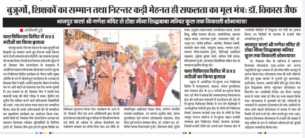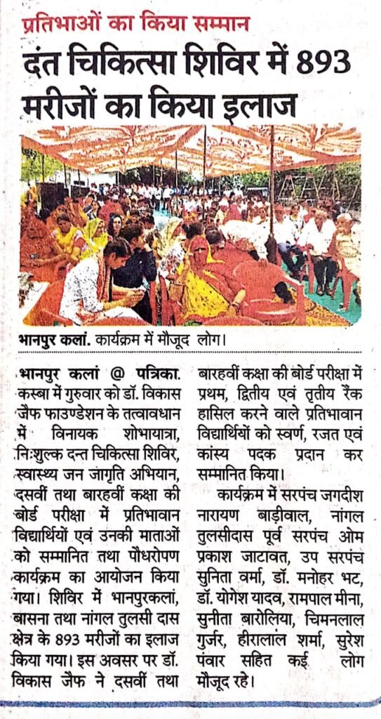 इससे पूर्व डॉ. विकास जैफ ने इस निःशुल्क शिविर का विधिवत् शुभारम्भ किया। शिविर में दन्त रोग विशेषज्ञो ने अत्याधुनिक मशीनों द्वारा क्षेत्र के लोगों को चिकित्सा सेवाएं उपलब्ध करवाई गई तथा क्षेत्र के लोगों के लिए जयपुर डेन्टल कॉलेज मे निःशुल्क वाहन इत्यादि व्यवस्था द्वारा चिकित्सा सेवाएं उपलब्ध करवाई। इस शिविर में भानपुरकलां, बासना तथा नांगल तुलसी दास क्षेत्र के 893 मरीजों का इलाज किया गया। यही नहीं डॉ. जैफ ने दसवीं तथा बारहवीं कक्षा प्रतिभावान विद्यार्थियों को स्वर्ण, रजत एवं कांस्य पदक प्रदान कर सम्मानित किया तथा उनके उज्जवल भविष्य की शुभकामनाएं प्रदान की।